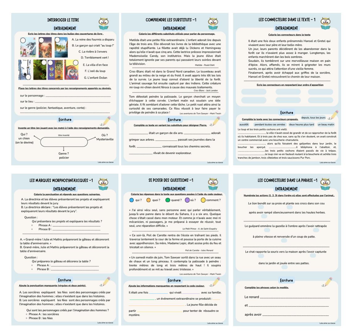 En réflexion toujours !. J’avais déjà réalisé mes Leçon à manipuler en lecture (LAM), j’affichais mes stratégies abordées avec les élèves au fur et à mesure dans le tableau DECLIC. J’organisais quelques ateliers de stratégies et je montais mes questionnaires de lecture en fonction des stratégies étudiées. Puis je liais avec le DRAS quand c’était possible mais il me manquait une chose essentielle :  des exercices structurés par stratégie.