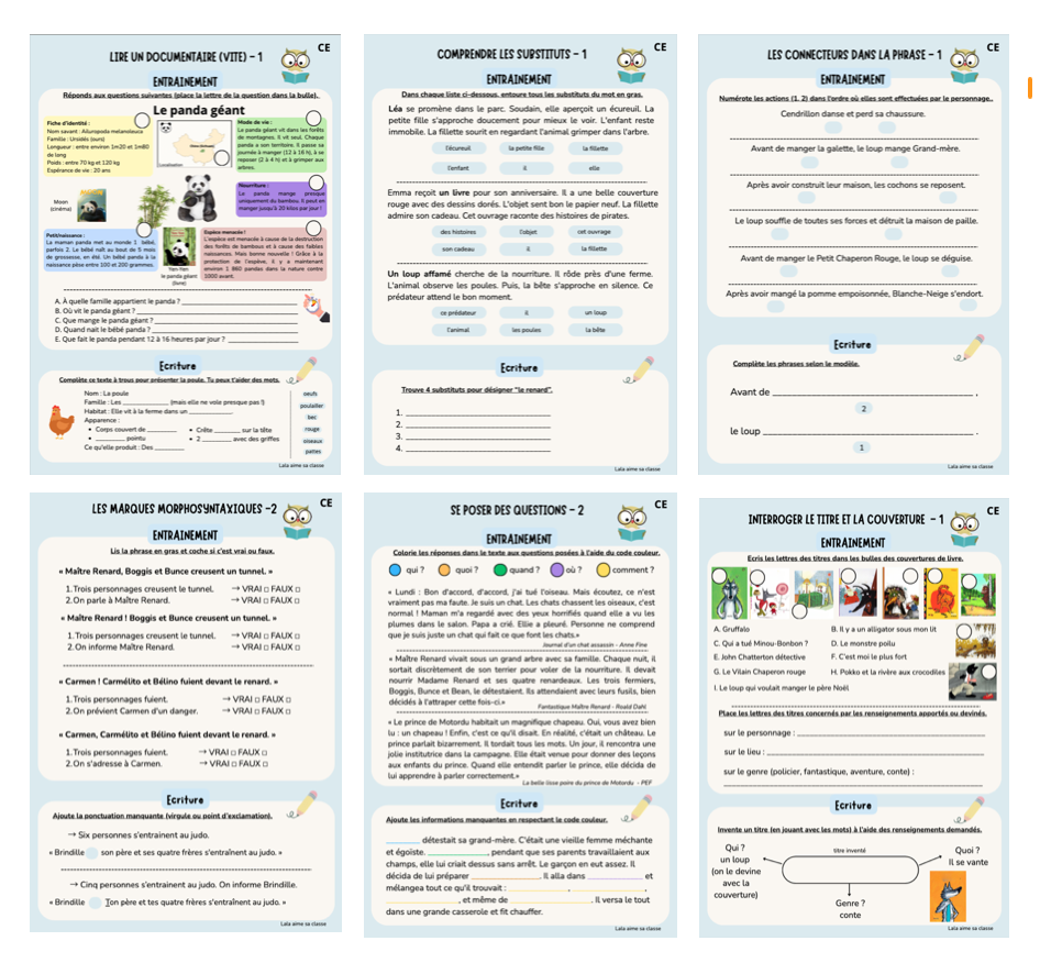 Voici le petit frère du dossier CM. Il permet de lier la lecture et la production écrite avec notamment le DRAS. Il comprend les mêmes stratégies que le dossier CM mais il s’adresse cette fois aux CE1/CE2. Mon fonctionnement DECLIC/DRAS est expliqué dans l’article du dossier CM. (clic)