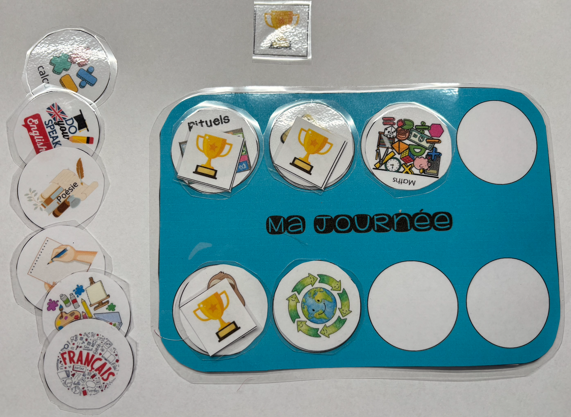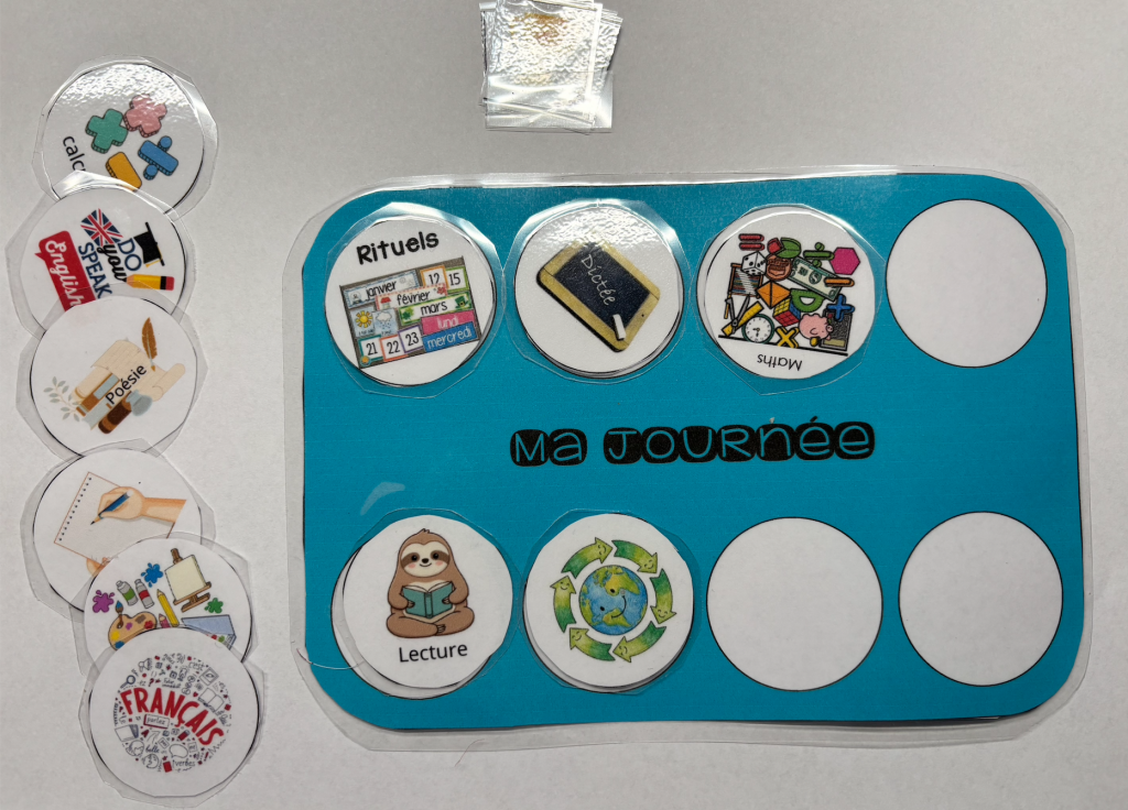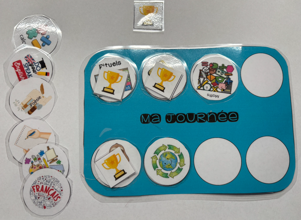Même principe avec ces cartes de valorisation planning : petite carte « contrat »dans laquelle l’élève place avec l’aide du PE les activités qu’il s’engage à faire dans la journée (ligne du matin en haut, ligne de l’après-midi en bas). Au début, on acceptera que l’élève en fasse 3/3 sur 4 par exemple avec des pauses attentionnelles (dessin, origami…). En fin de matinée (et journée) l’enseignant.e valorise les réussites de l’élève en plaçant une petite coupe sur chaque activité finalisée.3 objectifs :